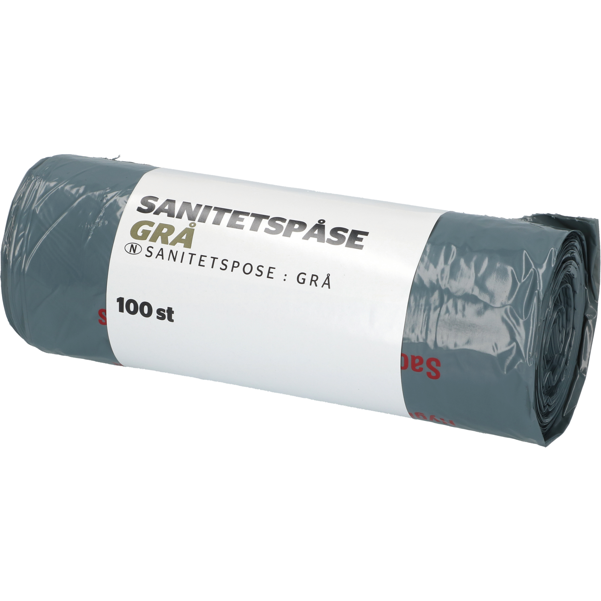- Gråa sanitetspåsar i plast för bindor och andra produkter som inte bör spolas ner i toalettstolen.